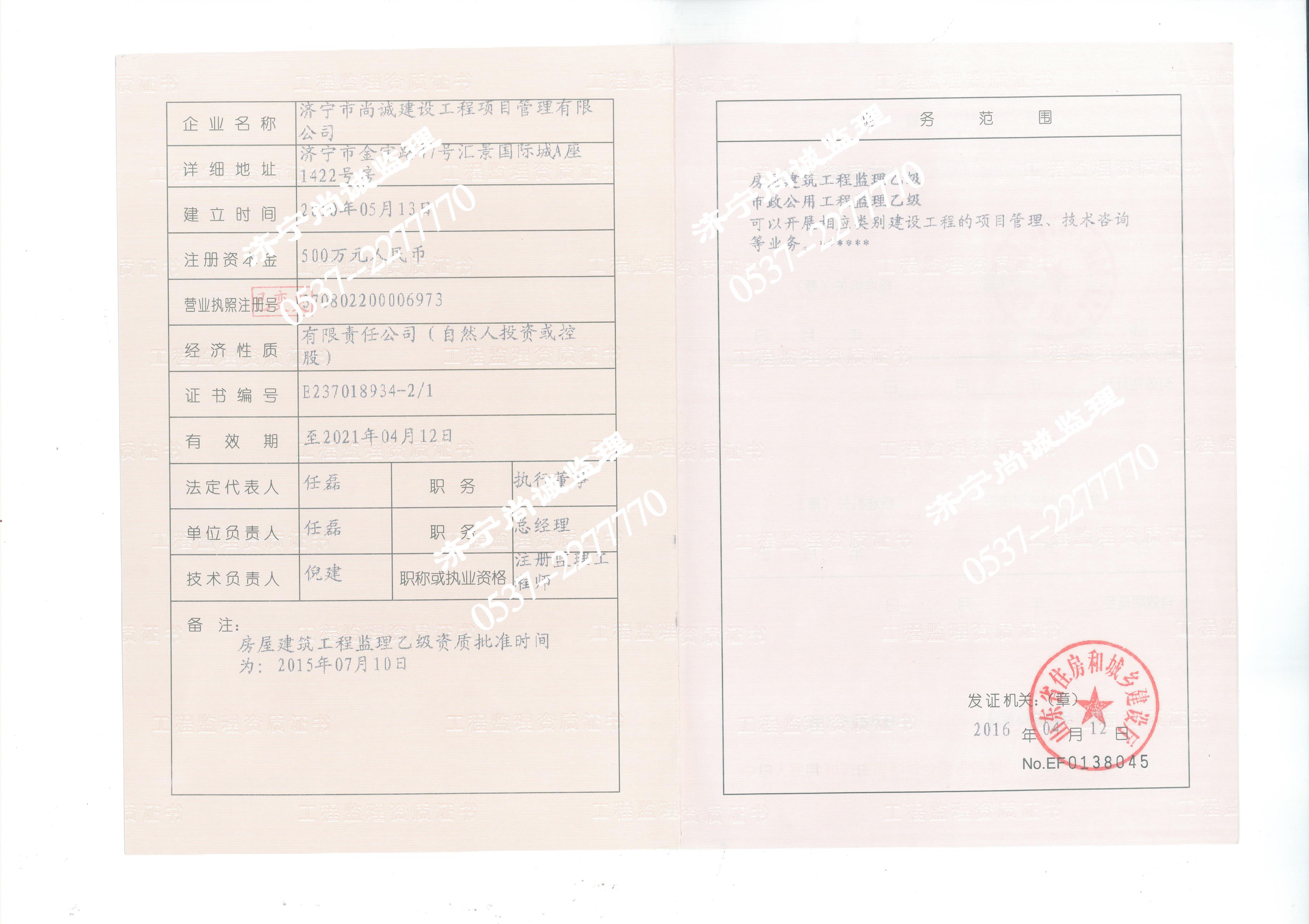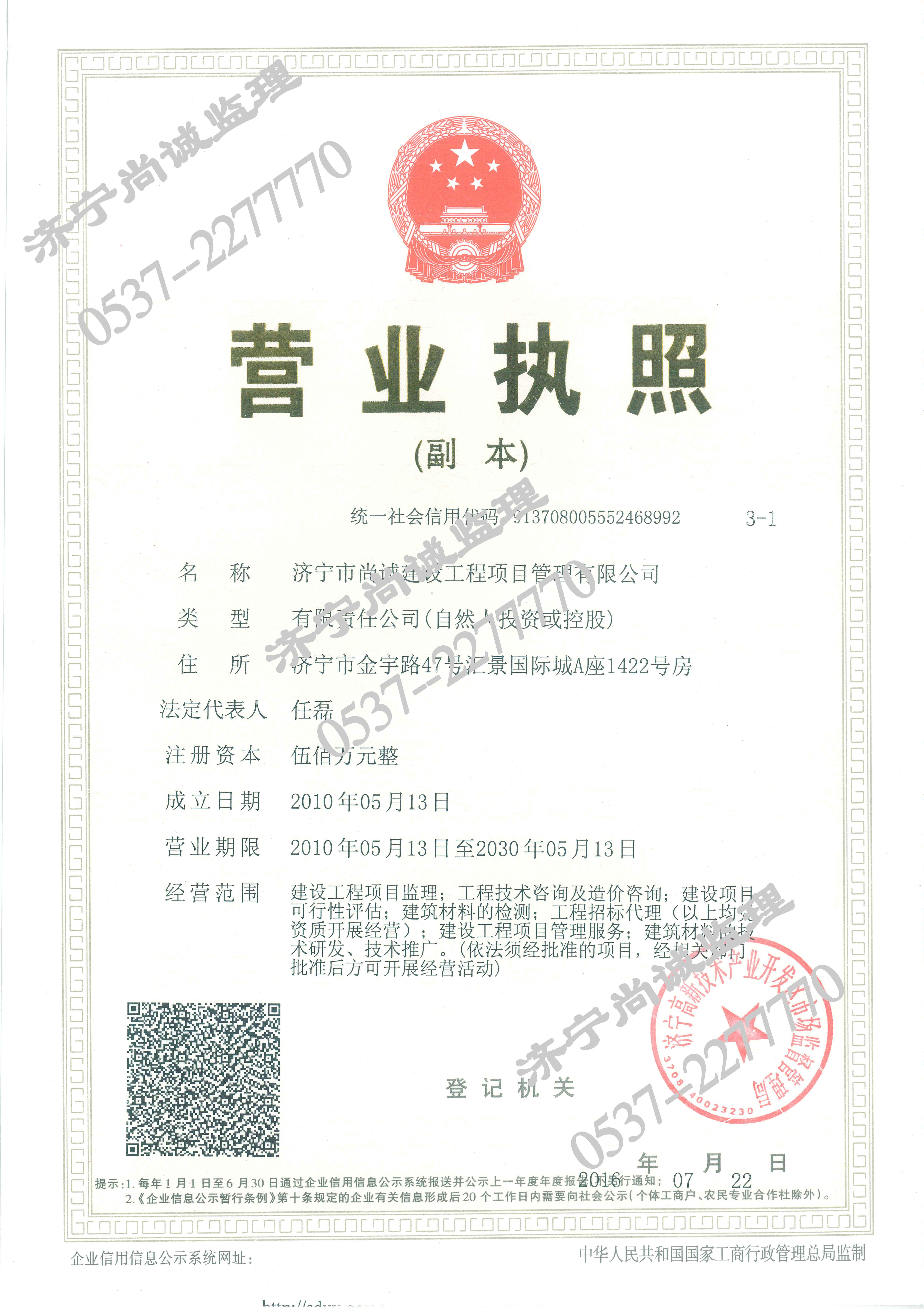 公司介绍:济宁市尚诚建设工程项目管理有限公司,创办于2010年5月,注册资本为500万元,位于济宁市任城区供销路北首南刘庄商业街西侧,现具有房屋建筑工程监理乙级、市政公用工程监理乙级、人防工程建设监理丙级资质. 专业技术和管理力量是公司发展的核心,目前公司共有140多名员工,高级管理人员12名,60余名专业技术人员及15名中层管理人员,其中本科学历职工人数比例已达到80%,职工平均年龄不到30岁,这一批有活力有干劲的年轻人组成了公司的核心发展力量。包含部门有业务部、市场开发部、人力资源部、监理部等。优异的工程业绩和良好的社会信誉是公司发展的保障,近期工程案例:济宁金乡云水台小区(210000㎡)、济宁顺河佳园(82000㎡)、济宁微山绿化工程、济宁泗水润泽国际机场(总投资10亿元,占地460亩)、济宁亿丰时代广场(430000㎡)、济宁绿城嘉祥玉兰花园(占地20万,400000㎡)等等。