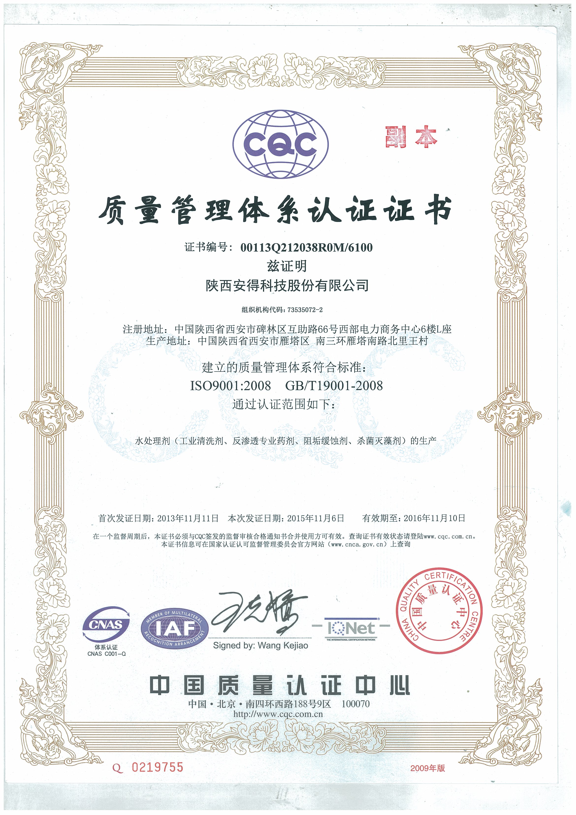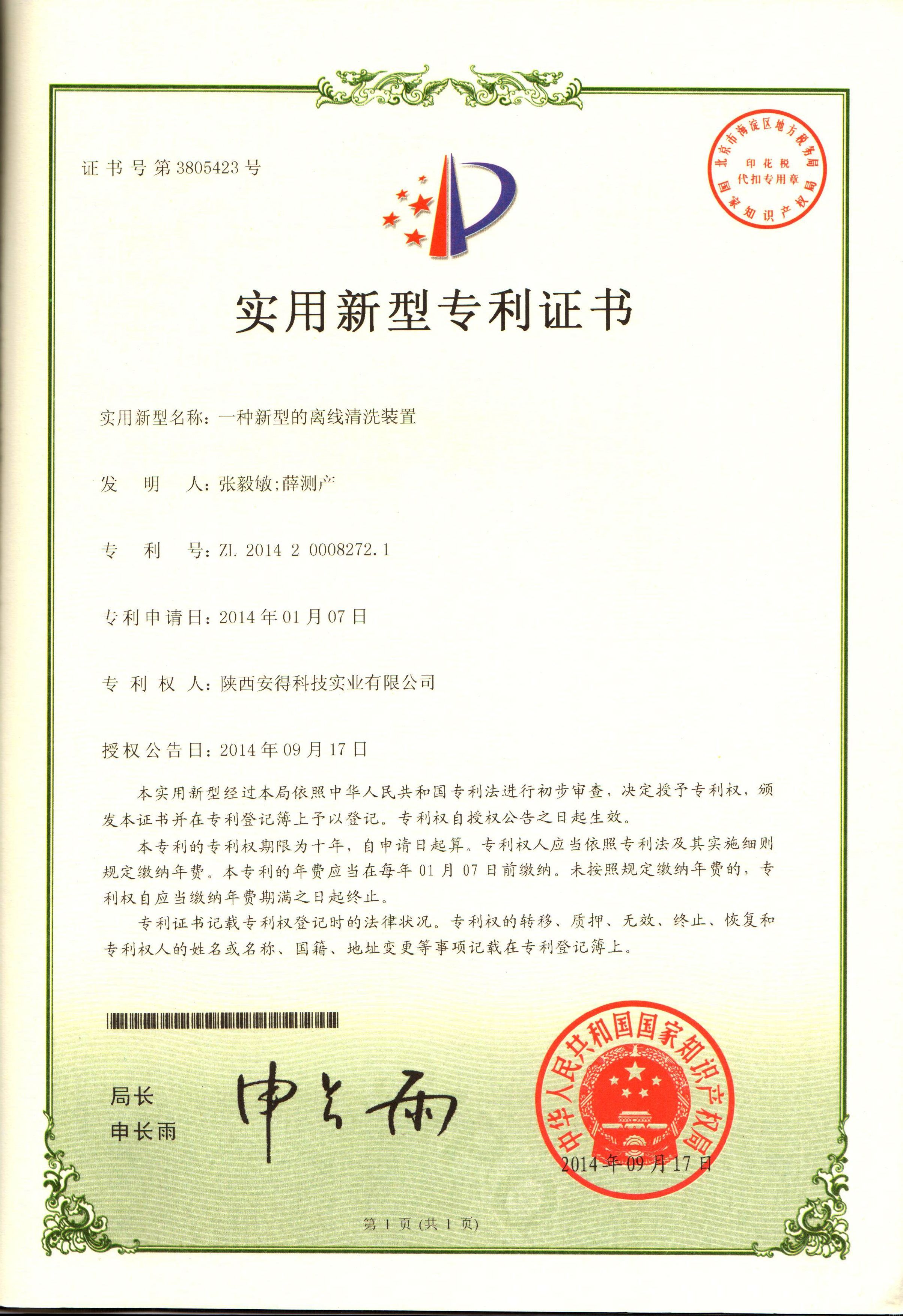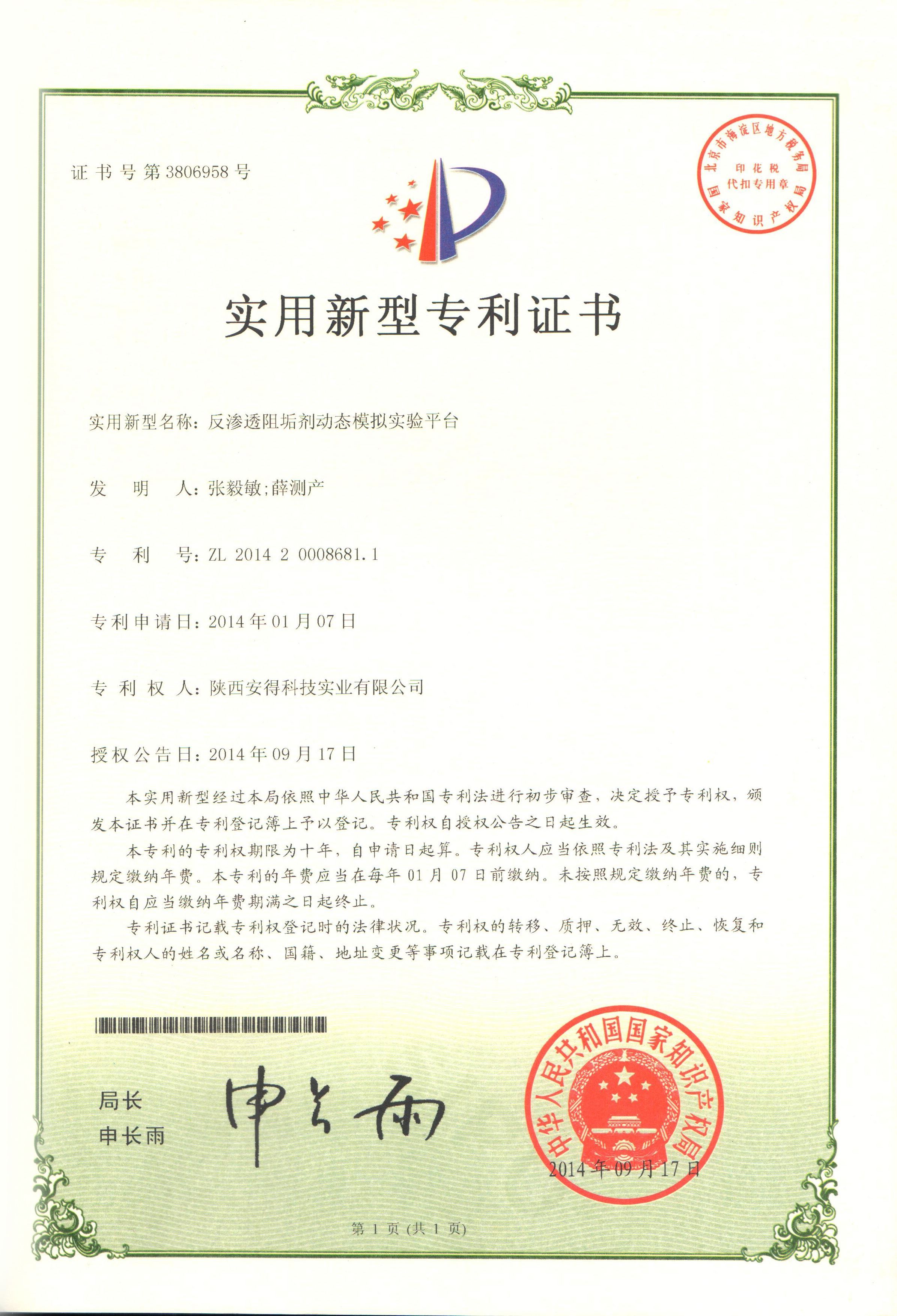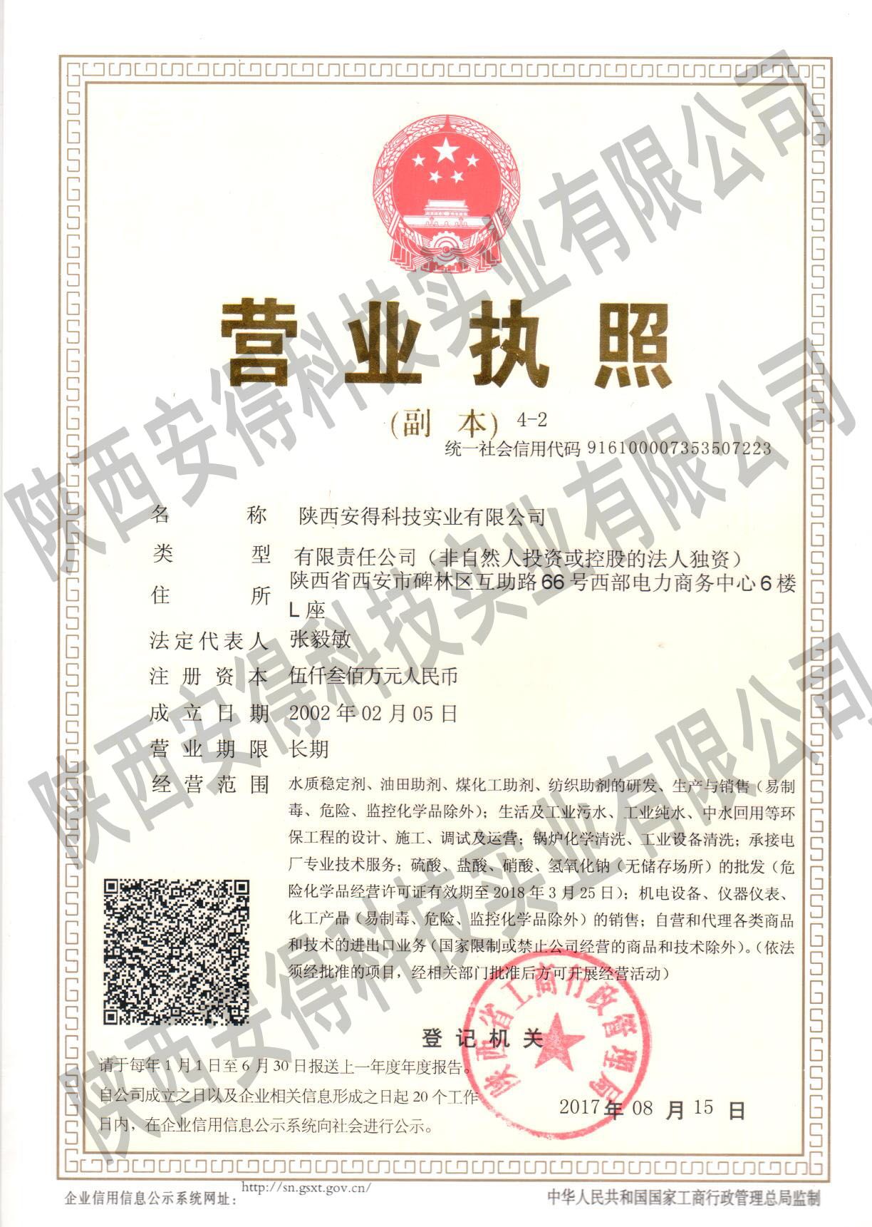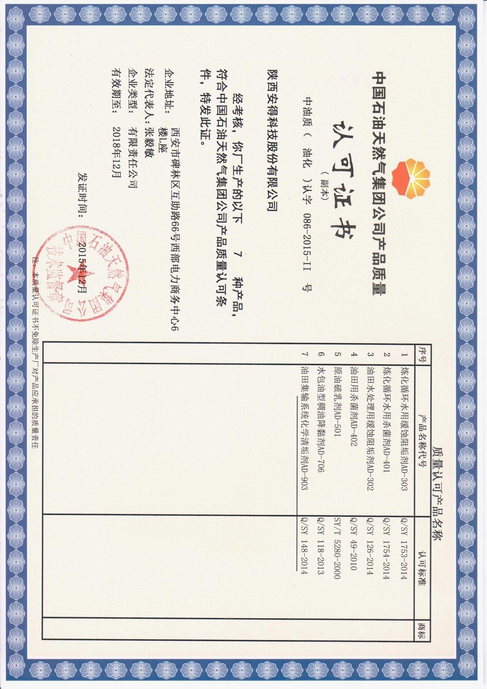 公司介绍:陕西安得科技实业有限公司,成立于2002年02月05日,注册资金 5300万元人民币;公司主营业务:水质稳定剂、油田助剂等环保型工业助剂的研发、生产与销售;全方位的水处理解决方案;工业设备清洗;市政、工业污水、纯水工程设计、施工等综合服务;安得科技( 834942)于2015年12月29日在新三板成功挂牌;2016年11月4日,安得科技与河南清水源科技股份有限公司(300437)完成发展战略协议签订,成为其出资控股的唯一一家新三板挂牌公司,此次合作为公司在水处理行业长远发展奠定基础。 公司是国内较大的水质稳定剂和油田助剂专业研发、生产及服务的厂家之一,是较早全面开发环保型水质稳定剂和油田助剂等工业助剂的化工企业。共有员工92人,享受国务院津贴的高级工程师2人,博士1人,硕士研究生4人,高级工程师3人,工程师15人,助理工程师19人,研发人员17人,会计师1人。产品涵盖阻垢剂、分散剂、阻垢缓蚀剂、杀菌灭藻剂、絮凝剂、破乳剂、缓蚀剂等多种产品,广泛应用于化工、钢铁、电力、污水处理、石油等行业。