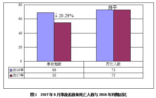 2017年6月,全国共发生房屋市政工程生产安全事故55起、死亡73人,比去年同期事故起数减少14起,同比下降20.29%,死亡人数持平(见图1)。