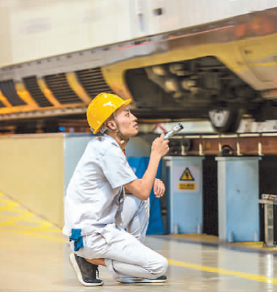 7月18日,西安铁路局西安动车段,动车组检修师一丝不苟地查看入库动车组车轮状态。王曙天 摄(人民视觉)