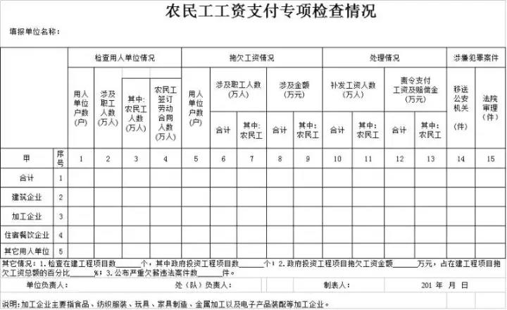 (七)认真做好材料报送和专项检查总结工作。1.请各省、自治区、直辖市及新疆生产建设兵团人力资源社会保障厅(局)于2018年1月5日前将本地区截至2017年12月31日专项检查工作阶段进展情况(包括检查用人单位户数、涉及农民工人数、拖欠农民工工资涉及人数、拖欠总额、补发工资人数及补发数额、农民工签订劳动合同人数)报解决企业拖欠工资问题部际联席会议办公室(设在人力资源社会保障部劳动监察局)。2.请各省、自治区、直辖市及新疆生产建设兵团人力资源社会保障厅(局)会同解决企业拖欠工资问题工作协调机制成员单位,及时对本地专项检查情况进行总结,分析存在的问题,提出相应的对策建议,于2018年春节后一周内将专项检查书面总结材料(附专项检查情况表)报解决企业拖欠工资问题部际联席会议办公室。