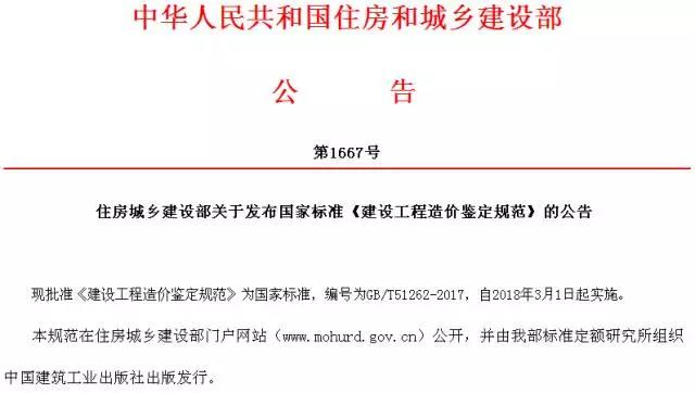 现批准《建设工程造价鉴定规范》为国家标准,编号为GB/T51262-2017,自2018年3月1日起实施。