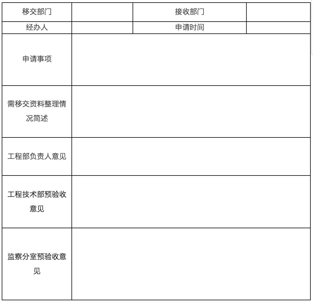 (4)填写《档案资料移交书》,向档案部门正式办理资料移交手续,并进行清点双方签字认可。